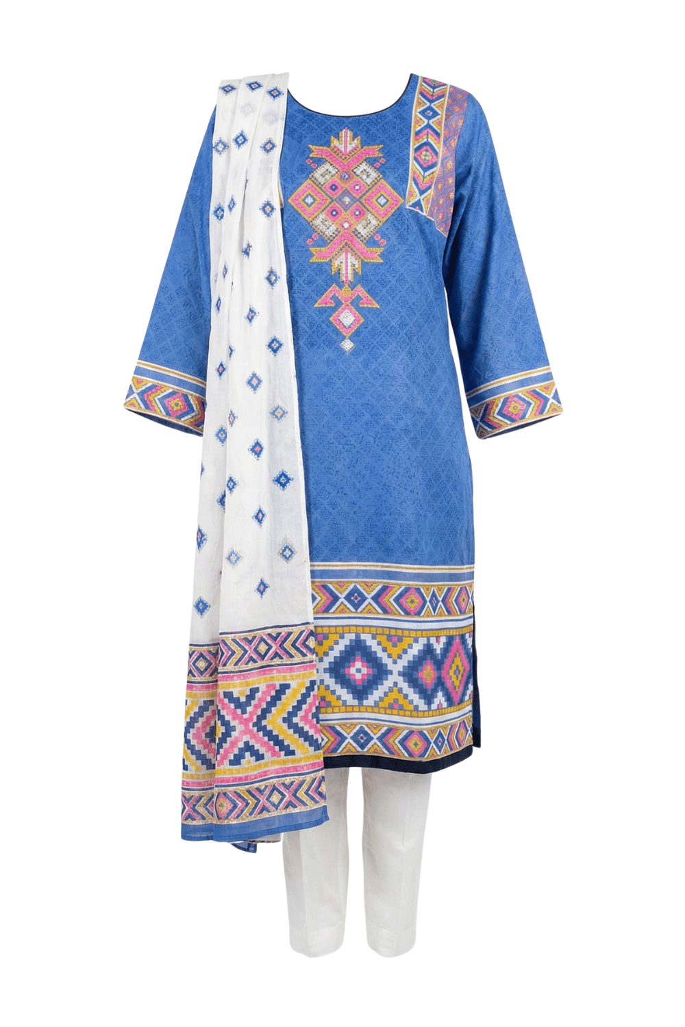 • আকর্ষণীয় ডিজাইন: উজ্জ্বল নীল রঙের ওপর গোলাপি, হলুদ এবং সাদার জ্যামিতিক নকশা (Geometric Print/Embroidery look) ড্রেসটিতে এনেছে এক আধুনিক ও স্মার্ট লুক। গলার কাজ এবং নিচের প্যানেলের ডিজাইন একে অনন্য করে তুলেছে।